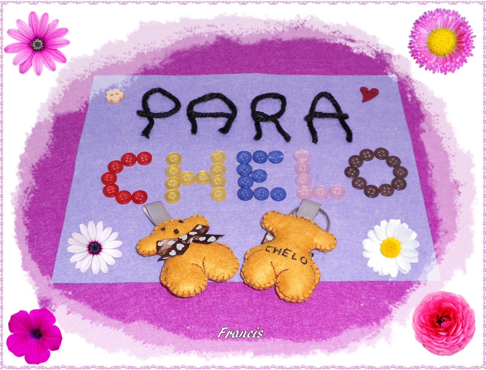 Y este es el llavero tan bonito que me envió Francis, aparte vino con uno de esos clips tan bonitos que podéis ver en su blog con una flor de ganchillo y dos servilletas decoradas ¡¡gracias!! Las dos fotos son de ellas....recogidas de sus blogs.
