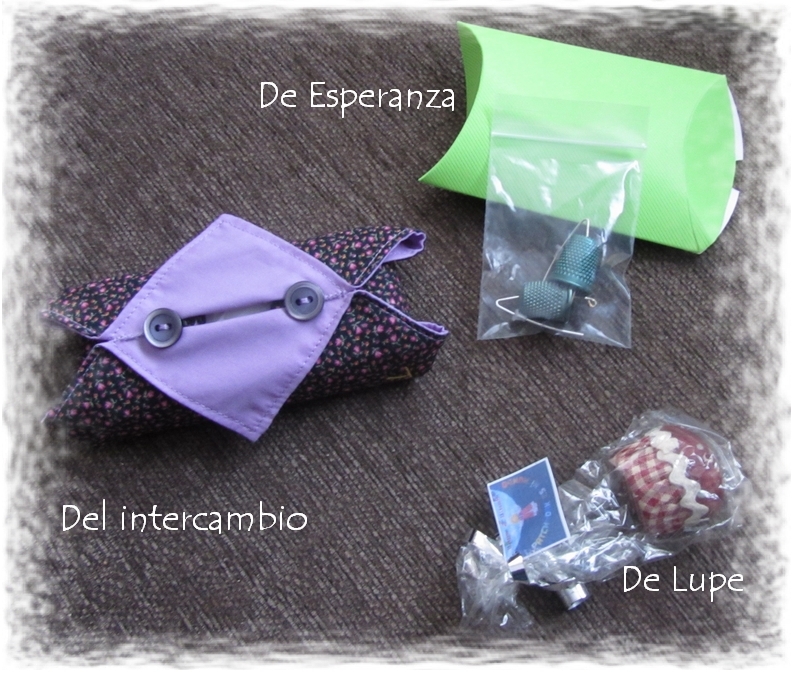 Aquí los regalos que me hicieron en la kdd; el regalo del intercambio fué el guardapañuelos de Carme que no tiene blog pero me sigue , los pendientes tan originales hechos con dedales fué un detalle de Esperanza que tuvo que irse pronto y apenas pudimos hablar...cachis... y el pequeño pastelito un detalle de Lupe.