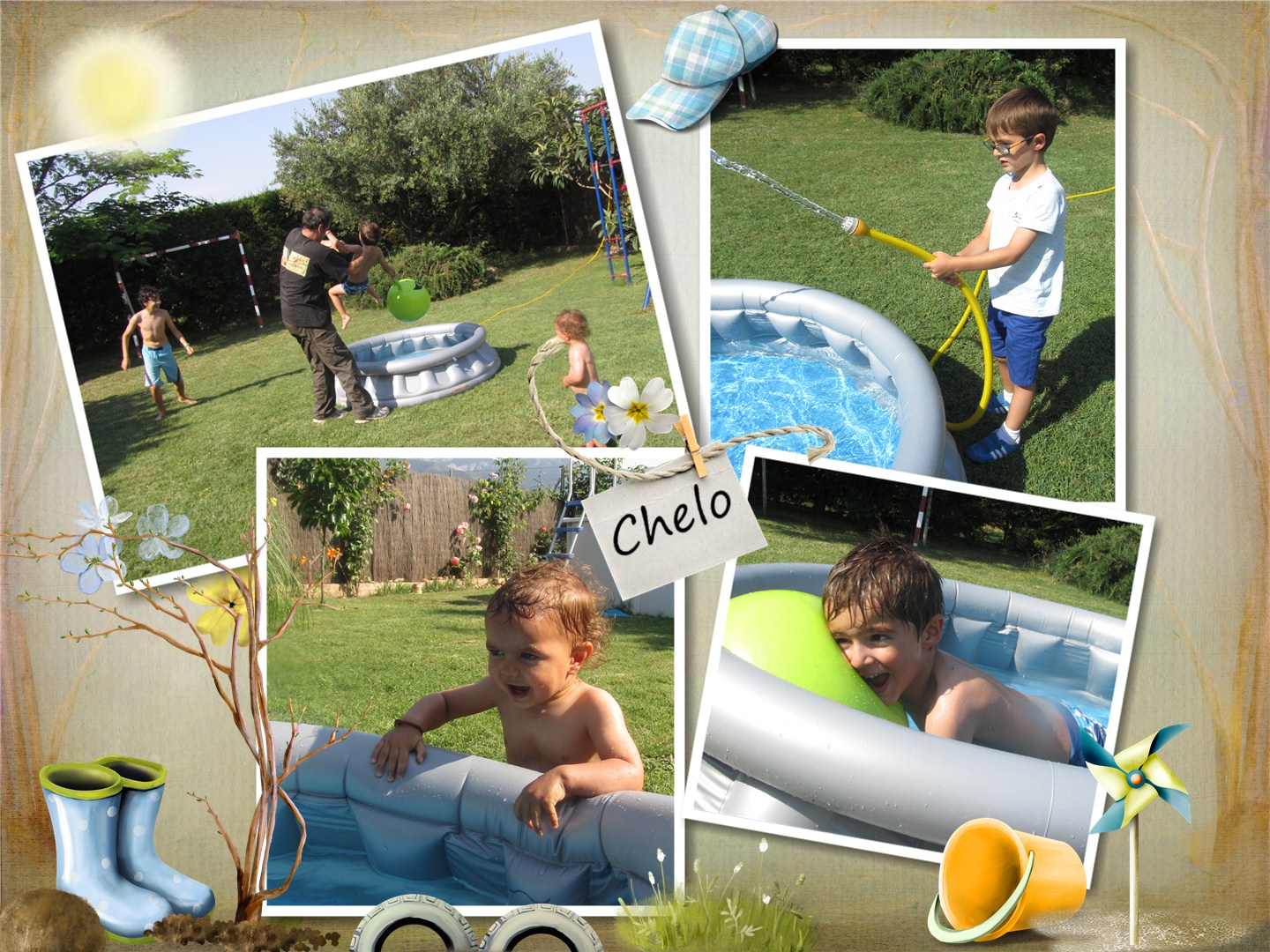 Hemos puesto una pequeña piscina hinchable para los peques, a Martín le da miedo la grande, la verdad es que es bastante miedoso con el agua, ahí pueden jugar a sus anchas!!! hasta Teo se metió con ellos para jugar y lo pasaron bomba. Martín fue el encargado de llenarla , lo que le gustan a este hijo las mangueras!!!!