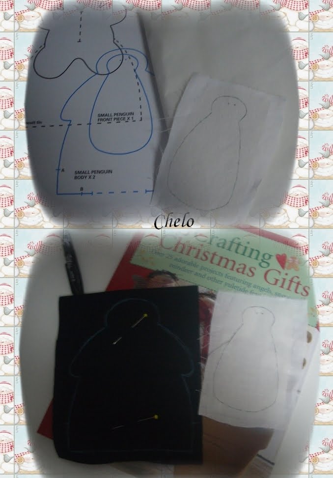 Ahora procedemos a pespuntear con perlé blanco alrededor de la zona blanca del cuerpo de nuestro pingüinito. Cosemos dos botones, yo los elegí rojos, a ambos lados de la cabeza como veis en la foto. Cortamos una tira de tela estampada o lisa...a gusto del consumidor!! para la bufanda, yo elegí este trocito de tela de cuadros en rojo/blanco, hay que aprovechar los pequeños trocitos que nos van quedando de otros trabajos ¡¡no se tira nada!! hasta el trocito más insignificante nos pueden servir para futuros trabajos.