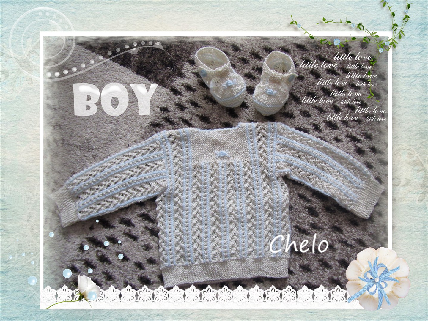 Y en esta otra foto mi trasto pequeño, Miguel, que para que se estuviese quieto tuve que dejarle el móvil porque es misión imposible sacarle una foto sin que me salga movida...y aún así....hice lo que pude!!! esta foto la tomé el Miércoles por la mañana puesto que terminé el jersey el Martes por la noche. Como veis también está guapísimo con él. Que tengáis buen fin de semana.