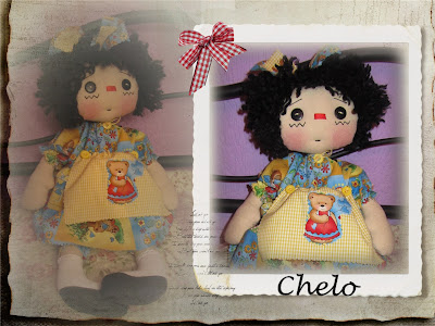 A ella le gustó la tela turquesa que utilicé para la otra y es lo único que puse igual, aunque en este caso la tela de los pantalones es la que utilicé para el vestido de la anterior y para el vestido utilicé la que puse en la otra para los pantalones y el delantal, pequeños detalles que hacen que cada una sea diferente y exclusiva, para las cosas iguales ya tenemos las que venden de serie!!! la artesanía es otra cosa....¿verdad? de ahí su encanto y su valor. Utilicé una tela de cuadritos vichy en amarillo/blanco para el delantal donde puse aplicado un osito del estampado del vestido. Para el lazo la misma tela de cuadritos y la del vestido . Por lo que se, ya la ha recibido y le ha encantado!!!!.